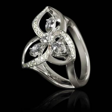 Bague en or 18K (12,3 g), pierre de 3 diamants navettes et un diamant rond au centre (0,57 carat), pavage en diamant (0,15 carat) ou diamant noir (0,15 carat) ou rubis (0,17 carat) ou émeraude (0,12 carat) ou saphir bleu (0,17 carat) ou saphir rose (0,17 carat)